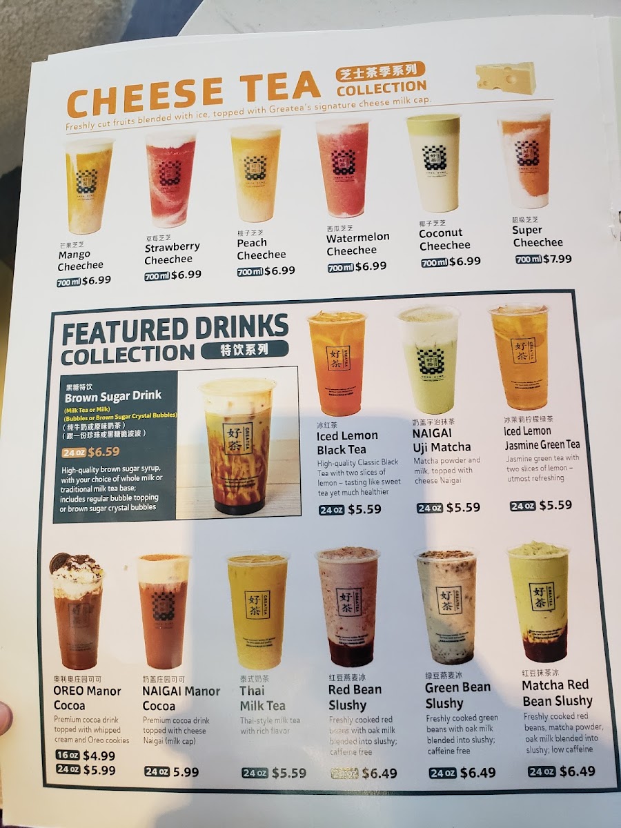 Welcome to Greatea, a delightful oasis for tea lovers located in Johns Creek, GA. Greatea elevates the tea experience with its innovative Cheese Tea Collection, featuring refreshing blends like Mango Cheechee, Peach Cheechee, and Strawberry Cheechee, all generously topped with their signature cheese milk cap. Each drink is crafted from freshly cut fruits, delivering vibrant flavors that are simply irresistible.